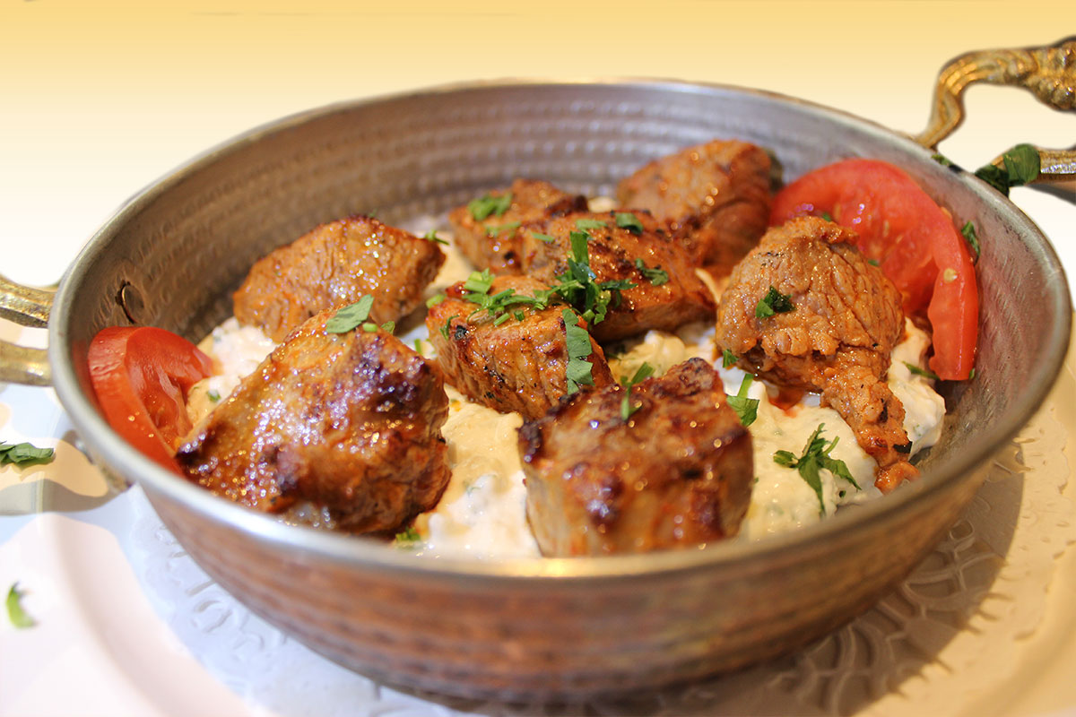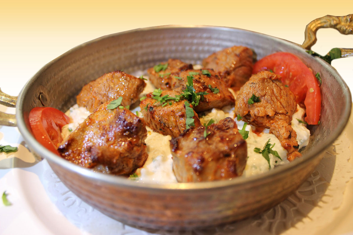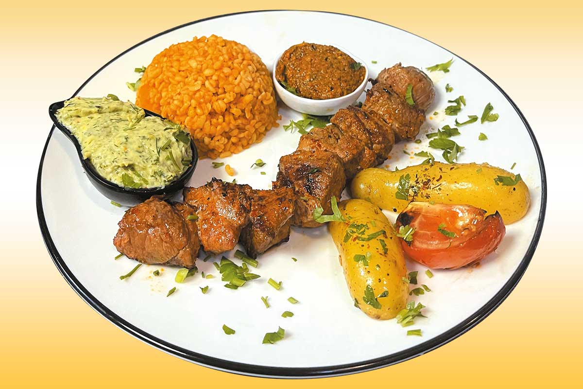 (Brochette de Gigot d’agneau, pain grillé, yaourt à l’ail) 23€